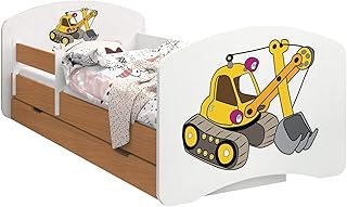 HappyBabies - Doppelseitiges Kinderbett MIT SCHUBLADE Modernes Design mit sicheren Kanten und Absturzsicherung Schaumstoffmatratze 7 cm Buche (Gelber Bagger, 140/70)