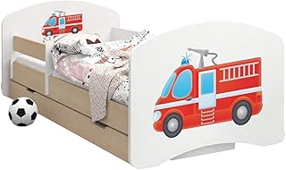 Happy Babies - Doppelseitiges KINDERBETT MIT SCHUBLADE Modernes Design mit sicheren Kanten und Absturzsicherung Schaumstoffmatratze 7 cm Leichte Birne (Feuerwehrauto, 160/80)