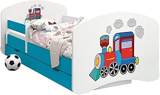 Happy Babies - Doppelseitiges KINDERBETT MIT SCHUBLADE Modernes Design mit sicheren Kanten und Absturzsicherung Schaumstoffmatratze 7 cm Blau (Lokomotive, 190x90)