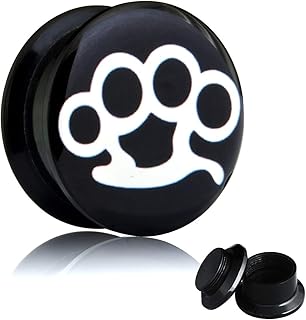 | Motiv Ohr Plug - SCHLAGRING - Schwarz & Weiß - 22 Größen: 3mm - 40mm - mit Gewinde zum Schrauben - Double Flare - Piercing Box Flesh Tunnel aus schwarzem Kunststoff/Acry - Brass Knuckles